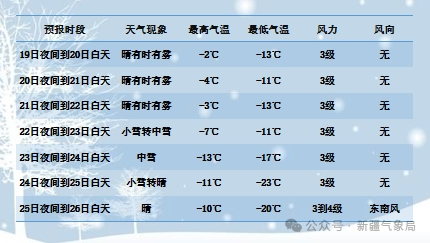 21夜间到22日白天,伊犁河谷西部、博州、塔城地区北部、阿勒泰地区北部、南疆西部等地的部分区域有微到小雪,其中博州西部山区、塔城地区北部山区、阿勒泰地区北部山区、喀什地区南部山区的局部区域有中到大雪,局地暴雪;上述部分区域有5级左右西北风,风口风力9~10级,阵风11级。天山北坡的部分区域和巴州等地的局部区域断续有阴雾或阴雪天气。全疆其它地区以晴或多云天气为主,风力不大。未来三天,天山北坡、阿克苏地区、巴州北部等地的部分区域断续有阴雾或阴雪天气,部分路段能见度低,对道路交通等有不利影响,需加强防范。19日夜间到20日白天晴有时有雾,风力3级。今天夜间最低气温-13℃,明天白天最高气温-2℃。预计未来两天乌市以晴有时有雾天气为主。
